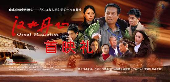 电影《汉水丹心》在北京人民大会堂举行首映盛典。这标志着我国第一部以南水北调移民为题材的电影,正式登陆荧屏与全国观众见面,向党的“十八大”献上一份厚礼。